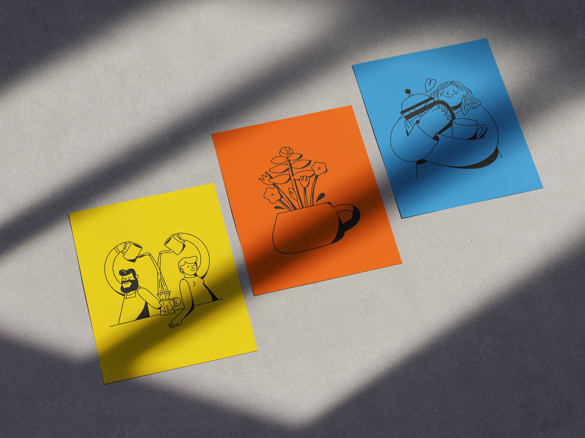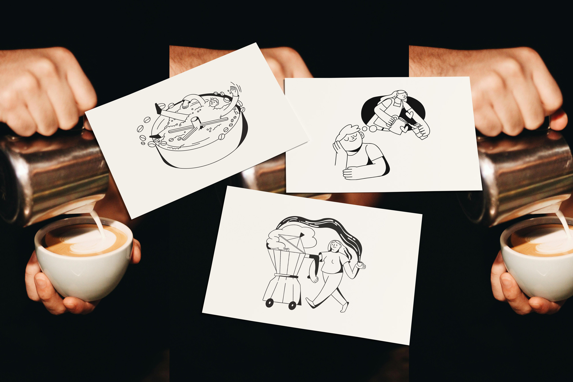 - Customer moments: illustrations of clients enjoying their daily coffee.